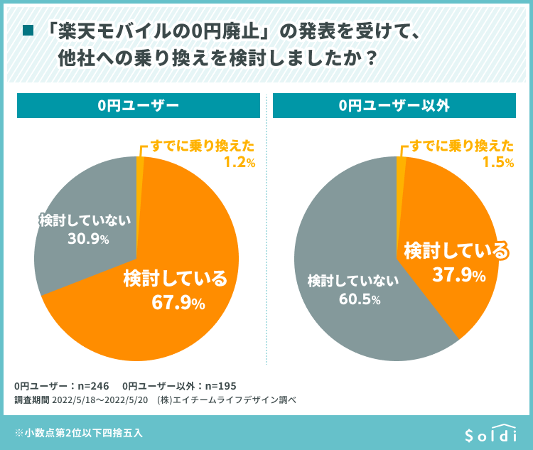 - 楽天モバイルの0円廃止発表を受けて0円ユーザーの約7割、0円ユーザー以外の約4割が乗り換えを検討している