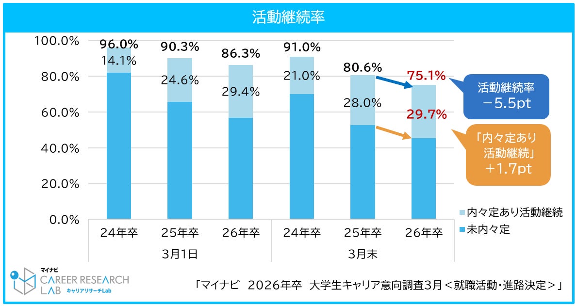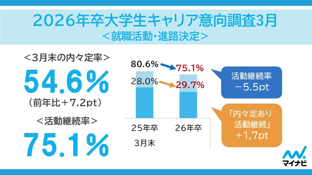 株式会社マイナビ(本社:東京都千代田区、代表取締役 社長執行役員:土屋芳明)は、2026年卒業予定の全国の大学生、大学院生を対象に実施した、「マイナビ 2026年卒大学生キャリア意向調査3月<就職活動・進路決定>」の結果を発表しました。