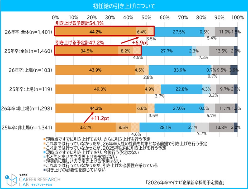3月末の内々定保有率は54.6%で前年比7.2pt増。中小企業を中心に活動する学生が増加。給与への関心が高まるなか、中小企業の初任給引き上げが影響か
