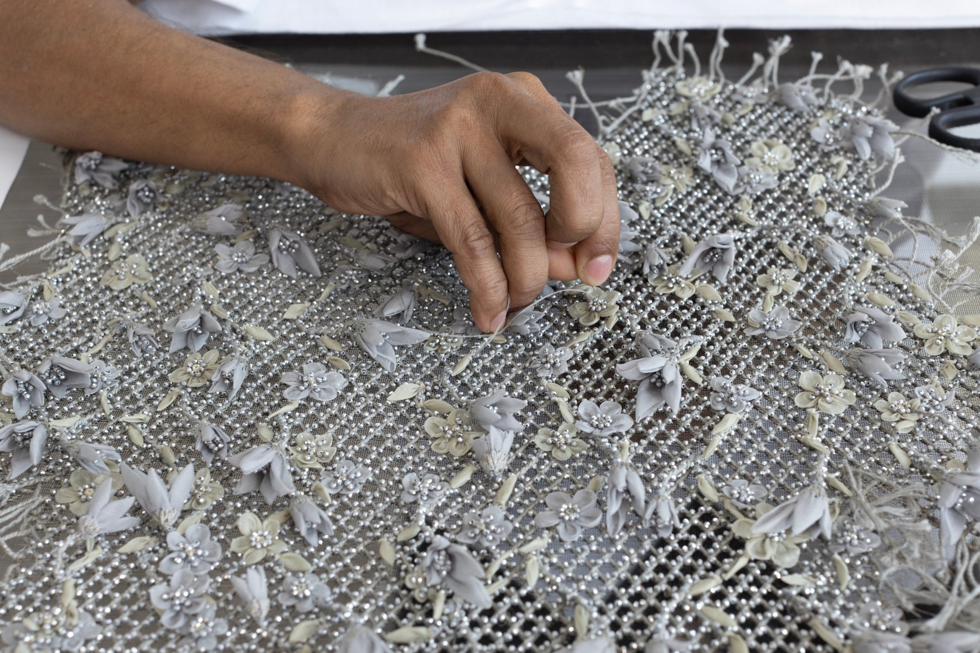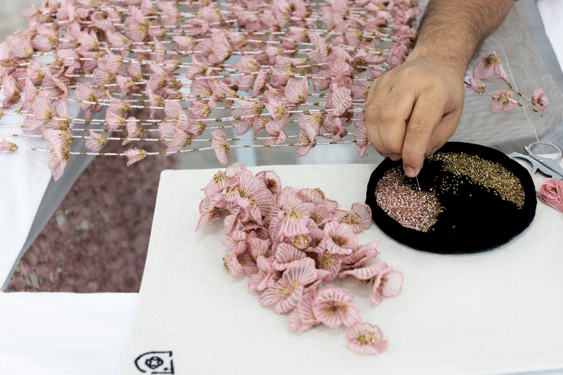 2025年春夏オートクチュール コレクションでマリア・グラツィア・キウリは、1920年代に描かれたダンスの絵画からインスピレーションを受け、その中に描かれていた花々に心を奪われました。そのアイディアは『鏡の国のアリス』をテーマにした繊細なシフォンドレスのデザインへと繋がります。「アリスの庭」を連想させる花びらは一枚一枚が繊細に形作られ、小さなビジューやビーズでポエティックに昇華されています。チャーナキヤ工房では、ドレスの上部とクリノリンに刺繍を施し、アリスが庭を通り抜ける様子を表現しました。コルセットは立体的なフラワーモチーフのメッシュで構成され、スカート部分には流れるようなガーランドが施されています。約1400もの花びらが使われたこのドレスは19世紀後半の技術を用いて再現され、クチュール技術の中でも最も多くの繊細さを必要する作品の一つです。