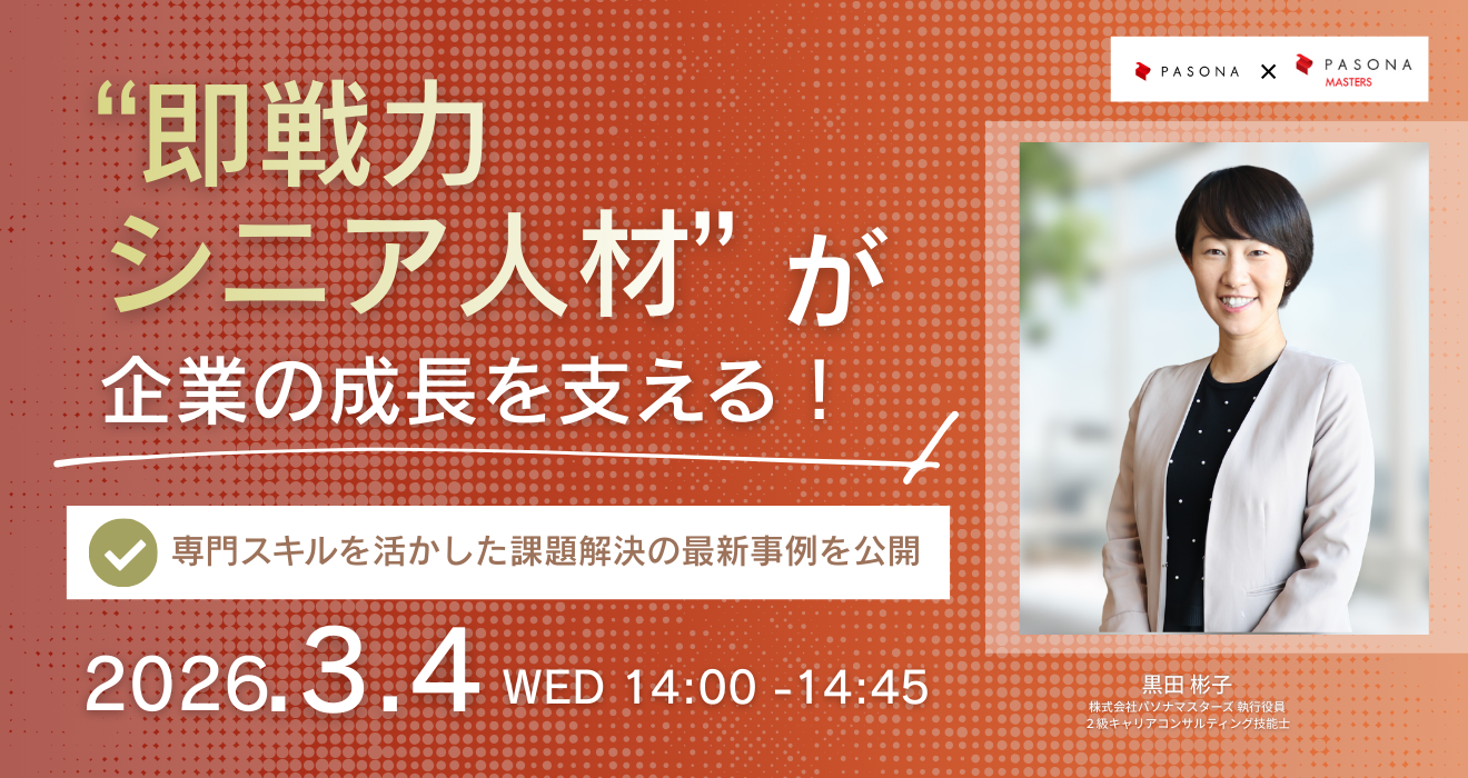 株式会社パソナは、株式会社パソナマスターズと共催し、即戦力となるシニア人材の活用をテーマとしたオンラインセミナーを2026年3月4日(水)に開催します。本セミナーは、人材不足や専門スキル人材の確保に課題を持つ企業担当者を対象としています。