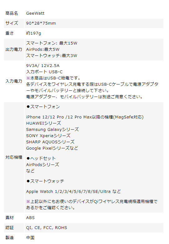 ※ 仕様欄に参考対応機種の記載がありますので、ご購入の前にお手持ちのスマートフォンやイヤホンなどデバイスがMagSafe/ワイヤレス対応機種であるかをご確認ください。急速充電は充電対象のデバイスが対応している必要があります。