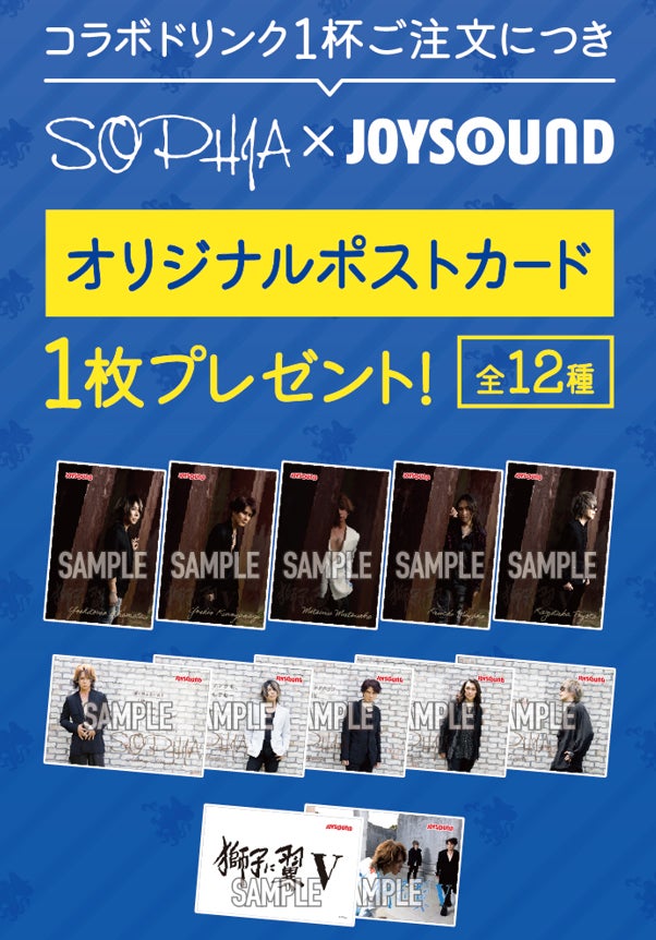 また、JOYSOUND直営店17店舗にて、オリジナルポストカード(全12種)付きコラボドリンクを展開します。コラボドリンクには、「SOPHIA」のバンドとメンバーをイメージしたコラボドリンク6種[各750円(税込)ノンアルコール]をご用意しました。注文特典として、コラボドリンク1品ご注文につき、オリジナルポストカード全12種の中からランダムで1枚プレゼント!