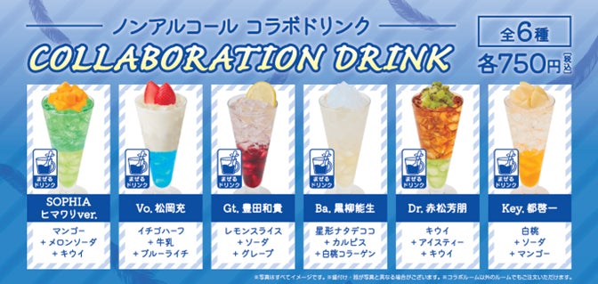 「SOPHIA」のバンドとメンバーをイメージしたコラボドリンク6種[各750円(税込)ノンアルコール]をご用意しました。
