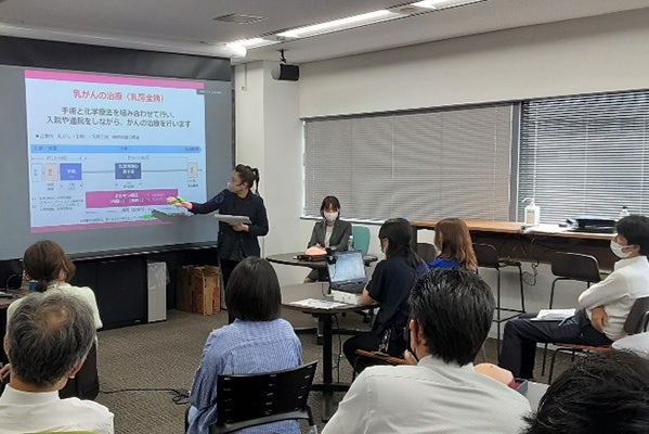 ・【NEW】2023年6月に「乳がん」に関するセミナーを実施し、リアルとオンラインを組み合わせて24名の参加となりました。乳がんに関する基礎知識や、早期発見・早期治療の大切さ、自宅でできるセルフチェックの方法などを学んだほか、発症した時にできる「しこり」の感触を触診モデルで体感しました。参加者へのアンケートでは、講座の満足度は100%、今後の生活に活かせると回答した割合は93%となりました。
