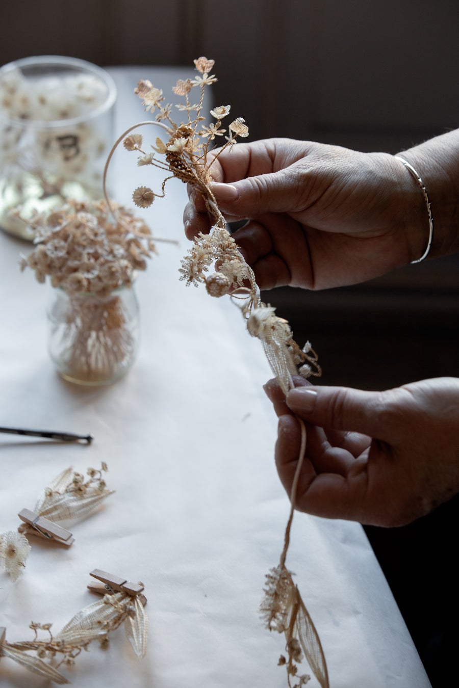 2025年春夏オートクチュール コレクションでマリア・グラツィア・キウリは、『鏡の国のアリス』の主人公、アリスが現代に蘇り、衣装の歴史を旅する姿を想像しました。限りないファンタジーやモチーフを生み出す場として焦点を当てられたクリノリンは、もともとはドレスにボリュームを持たせるための構造物で、ビクトリア朝時代のファッションで広く使用されてきました。クリノリンドレスを制作するにあたり、竹を専門とするフランス人アーティスト、ロール・ジュリアンが、竹の強度と柔軟性を活かした形状を作り出し、巨大なクリノリンは、フランス人アーティスト、ナタリー・セリエ・デジャンに渡されました。このクリノリンは藁を使ってオーガンザの花や小さなカタツムリ、ハチ、トンボなどで装飾され、好奇心にあふれたもので、『鏡の国のアリス』に登場したサイズが変わる動植物を彷彿とさせます。