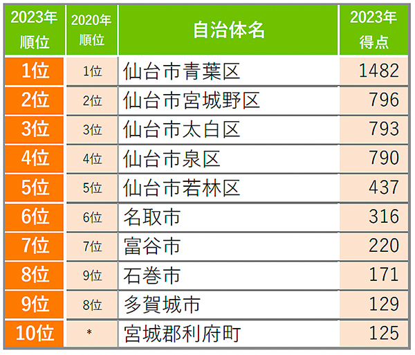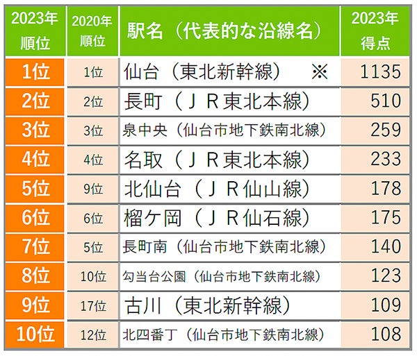 <駅>「仙台」が前回に続き連続1位「北仙台」が9位→5位に <自治体>「利府町」が圏外から10位にランクイン住み続けたい街ランキング2022で2位の魅力が浸透か