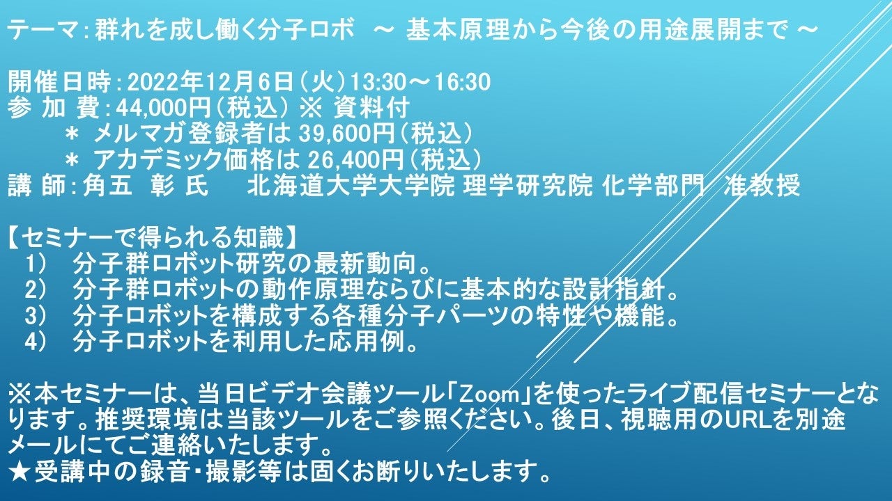 先端技術情報や市場情報を提供している(株)シーエムシー・リサーチ(千代田区神田錦町: https://cmcre.com/ )では、 各種材料・化学品などの市場動向・技術動向のセミナーや書籍発行を行っておりますが、 このたび「群れを成し働く分子ロボ ~ 基本原理から今後の用途展開まで ~」と題するセミナーを、 講師に角五 彰 氏 北海道大学大学院 理学研究院 化学部門 准教授)をお迎えし、2022年12月6日(火)13:30より、 ZOOMを利用したライブ配信で開催いたします。 受講料は、 一般:44,000円(税込)、 弊社メルマガ会員:39,600円(税込)、 アカデミック価格は26,400円(税込)となっております(資料付)。
