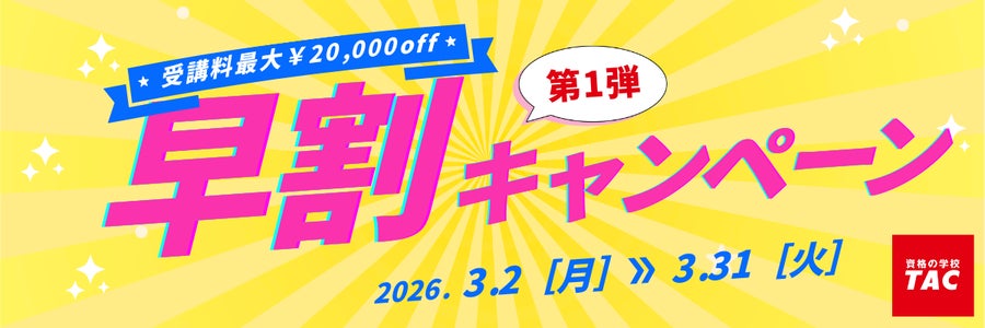 <申込締切期限迫る!>TACでは、3/31(火)までの期間限定で早割キャンペーン【第1弾】を実施中!もれなく最大20,000円オフでお申込みいただけます。