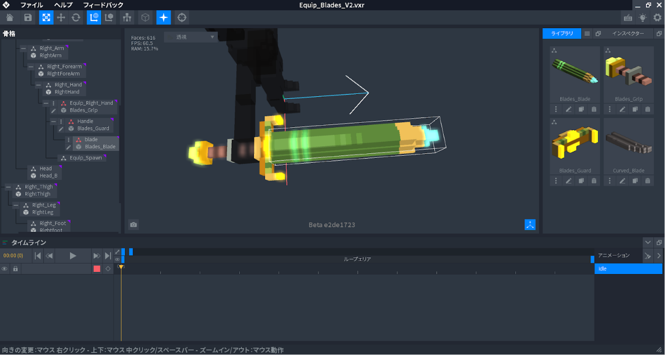 ③ 最後はGameMakerにて、VoxEditで作成した武器を装備させます。アセットには役割や機能も追加できます。