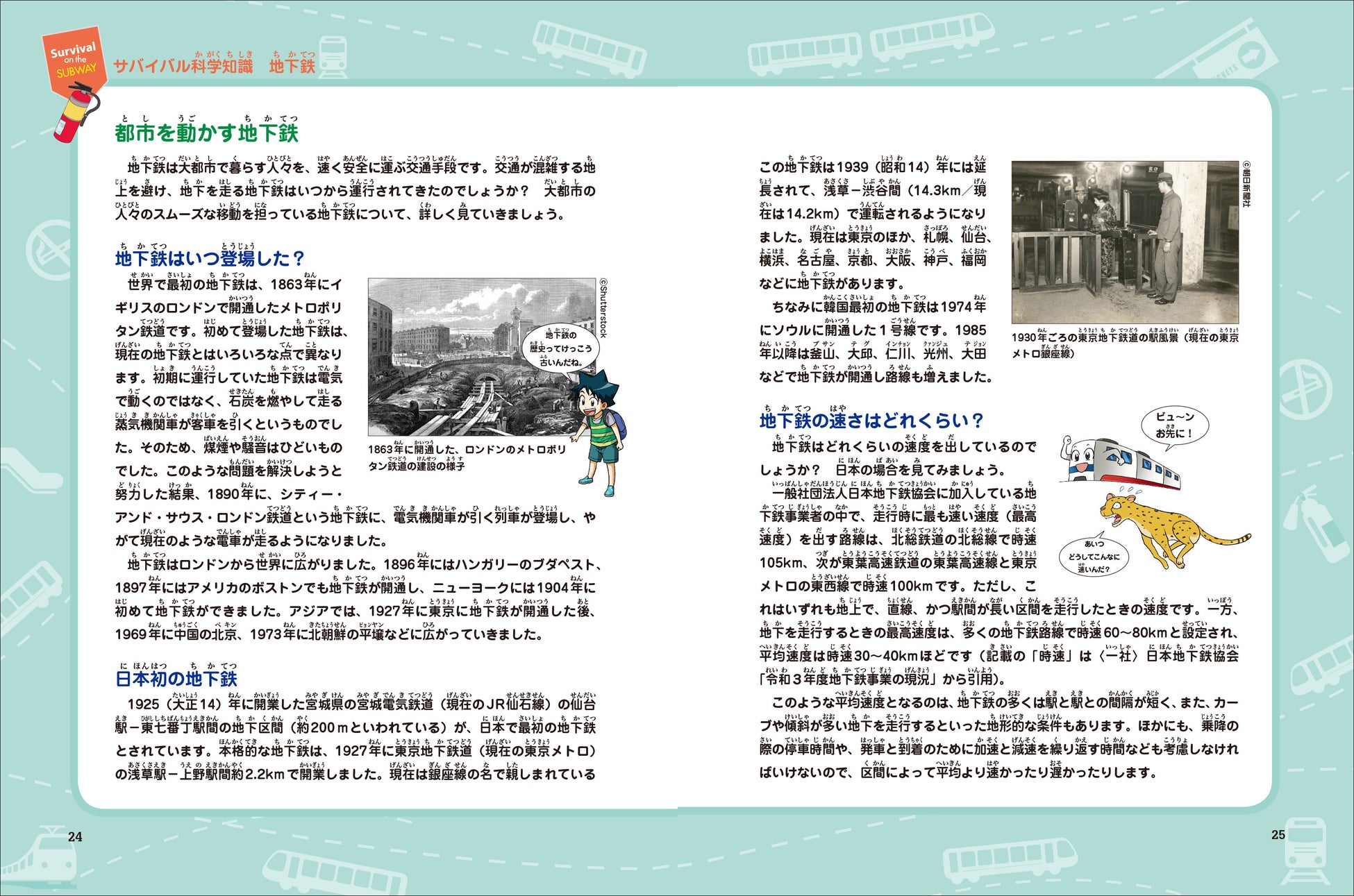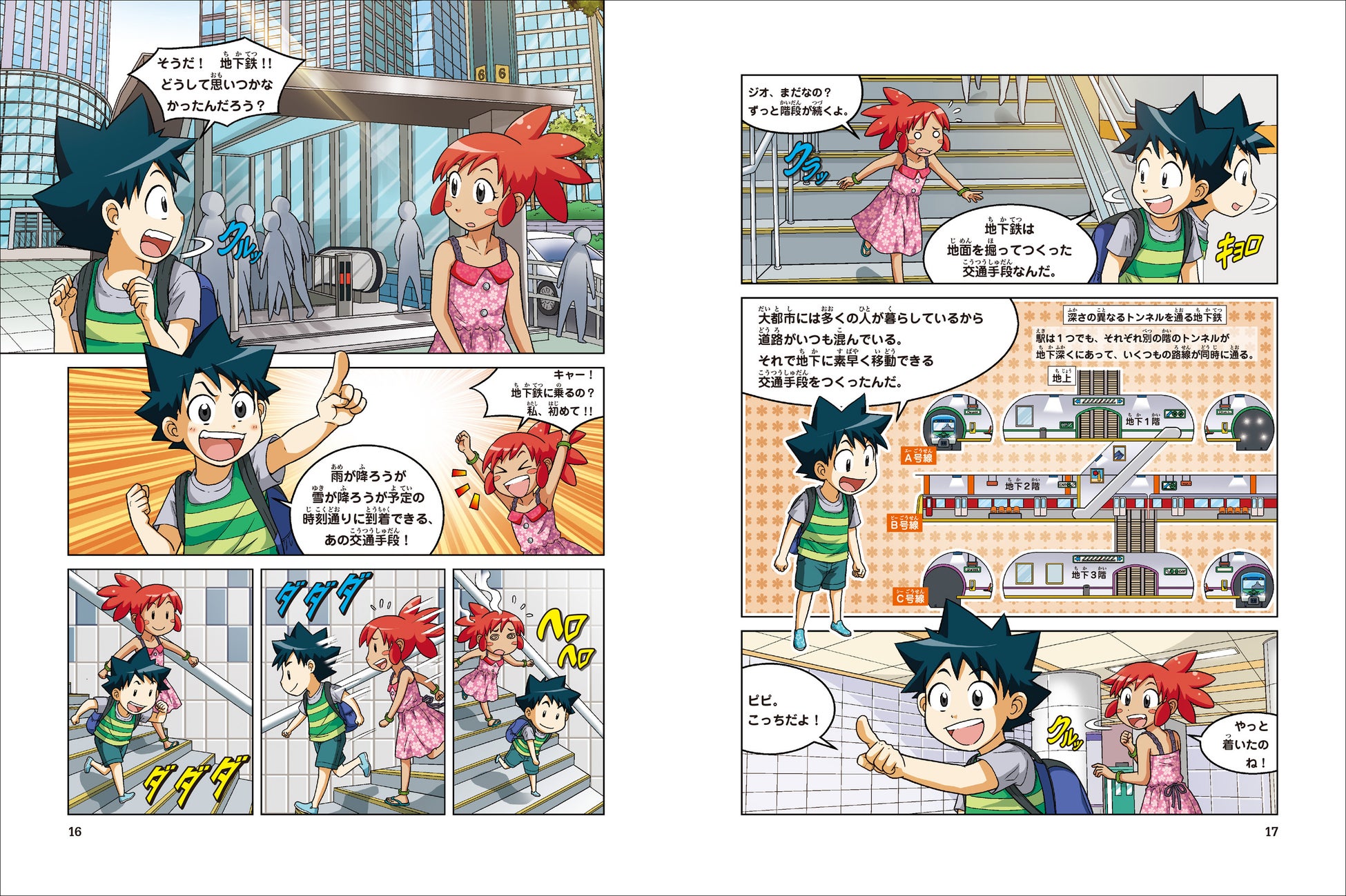 ノウ博士からパーティーに招待されたジオとピピ。混雑した道路を避けるために乗った地下鉄で、またもやとんでもない事件に巻き込まれてしまった! 地下鉄の構造、安全に走る仕組み、ルールやマナーなど、都市の交通のあり方がよくわかる!