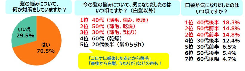 アンケートの結果、髪について悩みを抱えている人は91.3%となり、その悩みの中でも「白髪」が6割近くを占め、続いて「うねり・くせ毛」「ツヤがない」という順となりました。7割の人が髪の悩みに対策をとっていて、一番多かったのは「マッサージ」。頭皮ブラシやマッサージ器のほか、“塩”でマッサージをしているとの回答も。また、髪にいい食材を食べている、薄毛対策が得意な美容院に変えたという方もいました。
