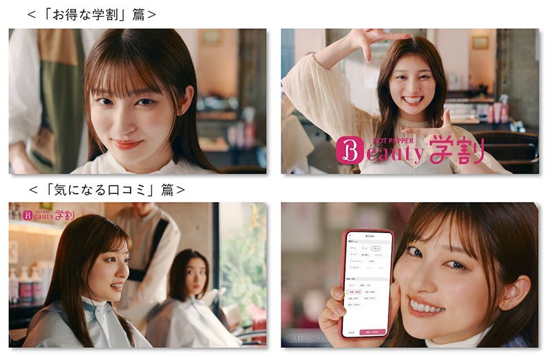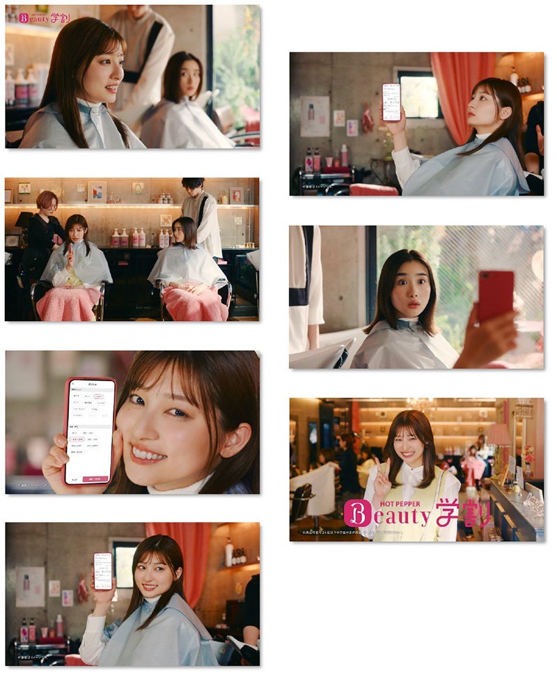 今回の新CMは、「お得な学割」篇、「気になる口コミ」篇の2篇となっており、どちらも吉川 愛さんが前回に引き続き出演しています。「お得な学割」篇は、吉川さんが、美容室でカットの最中、隣の席の人に、『ホットペッパービューティー』の学割クーポンのお得さを唐突に話し出します。思わず驚くその人に、鏡の中から小悪魔的にニヤリとする姿が印象的な内容です。また、「気になる口コミ」篇では、美容室のシャンプー台で隣になった人に向けて『ホットペッパービューティー』の、同世代や施術ごとに口コミを絞れる機能を紹介。最後は、「もっと知られていない…」と、さらに何か言いたげな表情のまま椅子を倒されてしまう吉川さん。クスっとできる内容となっています。