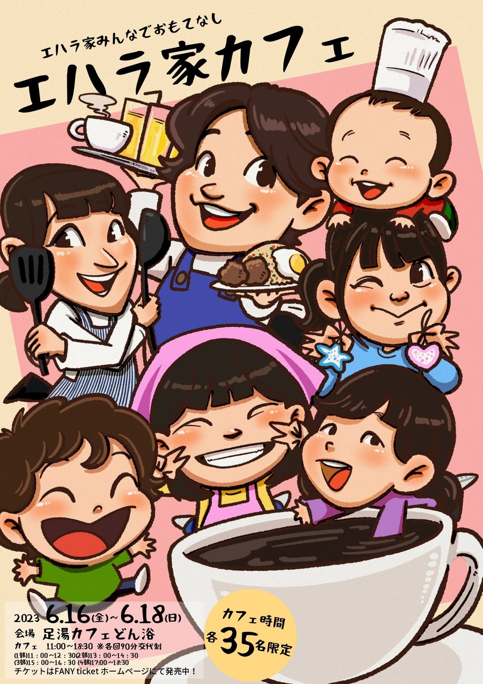 この度、YouTube「エハラ家チャンネル」(登録者数33万人)で大人気の“エハラファミリー”に会えるイベント、「エハラ家カフェ」の開催が決定致しました。6月16日(金)~18日(日)の3日間限定、エハラファミリー総出で皆様をおもてなしさせて頂きます!ご来場いただいたお客様には、お食事を楽しんでいただいたり、実際に子供たちと遊んでいただいたり…盛りだくさんの催し物となっております。チケットは、5/20(土)11時よりFANYコミュ「エハラマサヒロと死ぬまではしゃぐ会」会員様先行販売開始、一般販売は5/28(日)10時からFANYチケットにて開始いたします。皆様奮ってご参加ください。