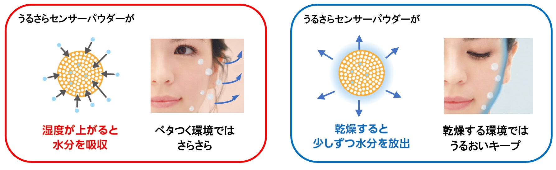 湿度が上がると大量の水分を吸収して保持、乾燥してくると徐々に放出。テカリやカサつきを防ぎ、快適なうるさら美肌が続きます。