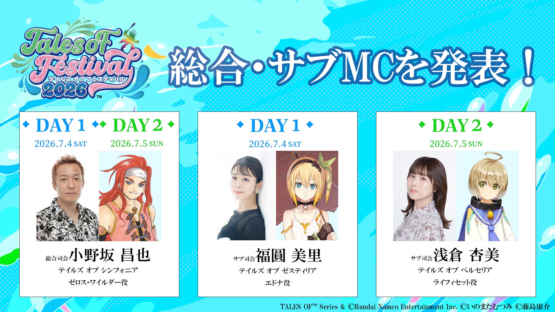また、本イベントでは、DAY1/DAY2ともに総合司会として「テイルズ オブ シンフォニア」ゼロス・ワイルダー役の小野坂 昌也さん、サブ司会としてDAY1に「テイルズ オブ ゼスティリア」エドナ役の福圓 美里さん、DAY2に「テイルズ オブ ベルセリア」ライフィセット役の浅倉 杏美さんにご担当いただきます。