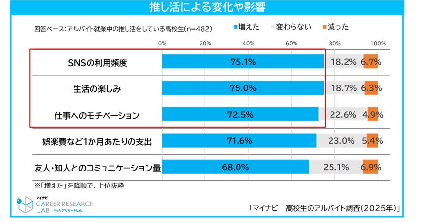 また、「推し活」による生活の変化で増えたことを聞くと、「SNSの利用頻度」が75.1%で最も高く、「生活の楽しみ(75.0%)」、「仕事へのモチベーション(72.5%)」が続いた。