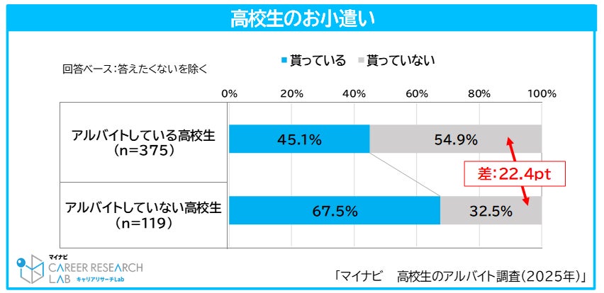 現在アルバイトをしている高校生のうち、お小遣いをもらっていない割合は54.9%で、アルバイトをしていない高校生と比較すると、22.4pt高い。