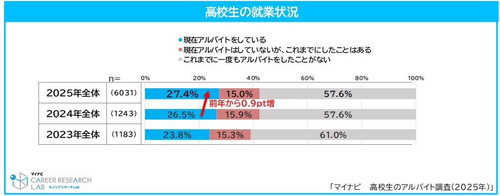 アルバイトをしている高校生の割合は27.4%で、前年より0.9pt増加した。