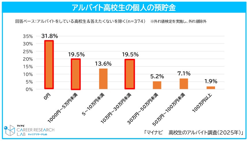アルバイトをしている高校生の預貯金を見てみると、「0円」が31.8%で最も高く、次に「1000円~5万円未満」と「10万円~30万円未満」が19.5%で同率だった。