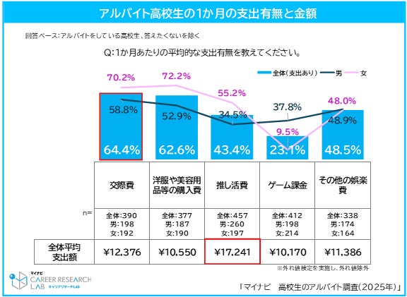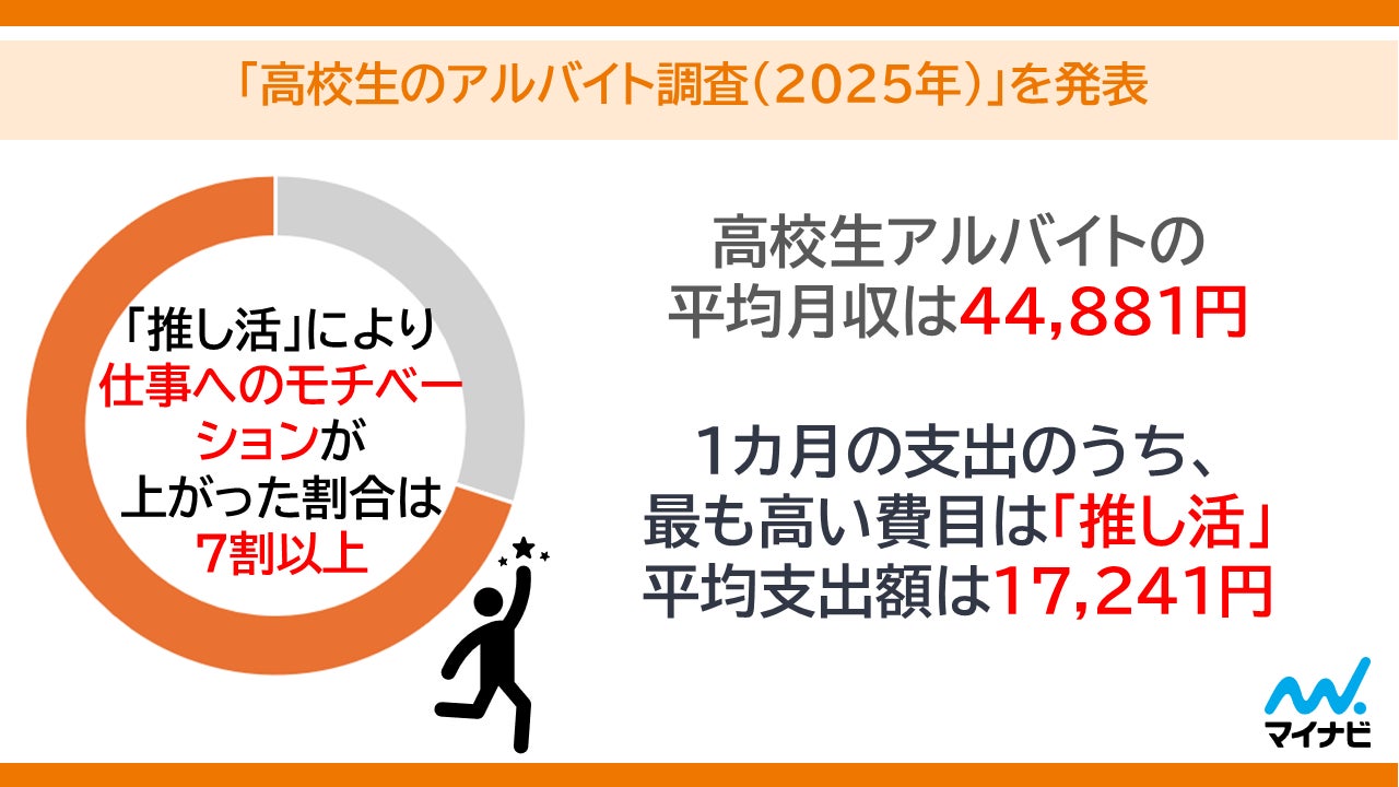 高校生アルバイトの平均月収は44,881円。1カ月の支出のうち、最も高い費目は「推し活」。平均支出額は17,200円。「推し活」により「仕事へのモチベーション」が上がった割合は7割以上