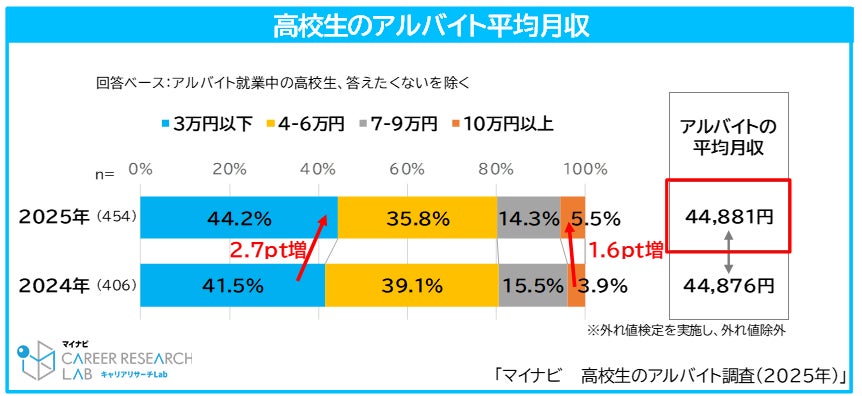 アルバイト月収は、「3万円以下」が44.2%(前年比2.7pt増)で最も多く、平均月収は44,881円だった。