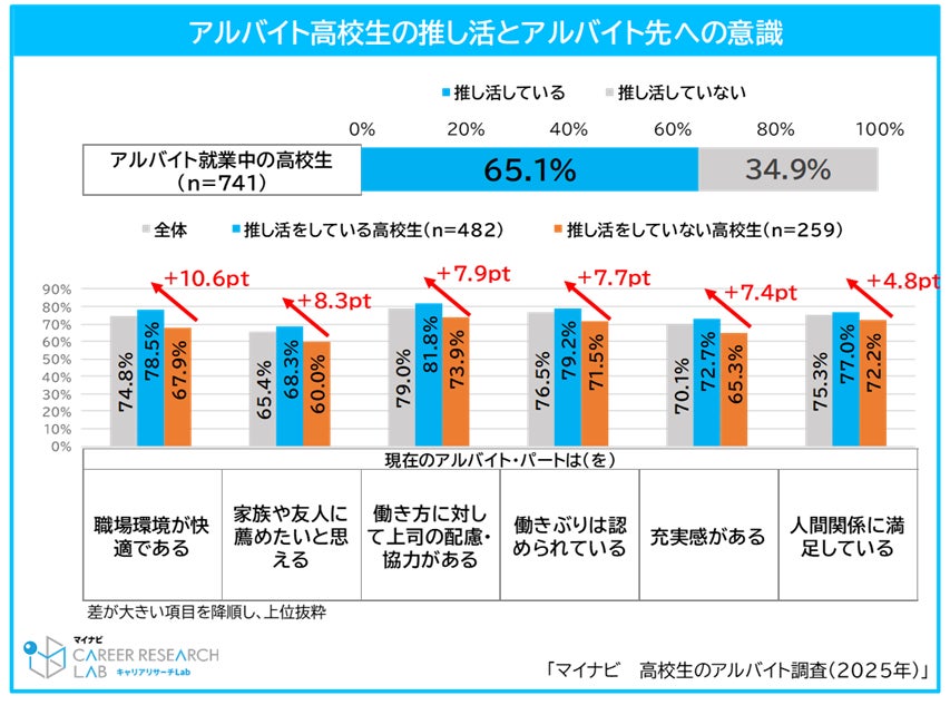 「推し活」をしている高校生は、「推し活」をしていない高校生と比較して、現在のアルバイト先に対して、「職場環境が快適である」と感じている割合が10.6pt高く、次いで「家族や友人に勧めたいと思える」が8.3pt、「働き方に対して上司の配慮・協力がある」が7.9pt高い結果となった。その他、自身の働きぶりが認められているという意識や充実感を感じている割合も7pt以上の差がみられた。