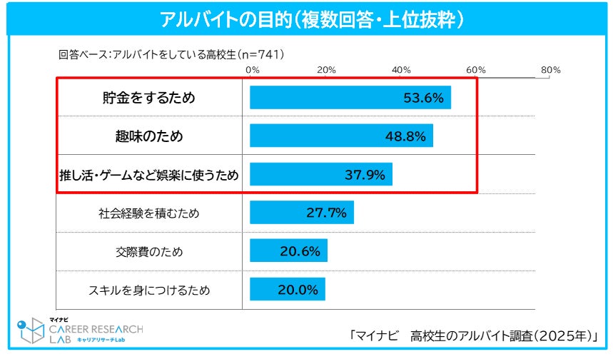 アルバイトの目的は、「貯金をするため」が53.6%で最も高く、次いで「趣味のため(48.8%)」、「推し活・ゲームなど娯楽に使うため(37.9%)」となった。