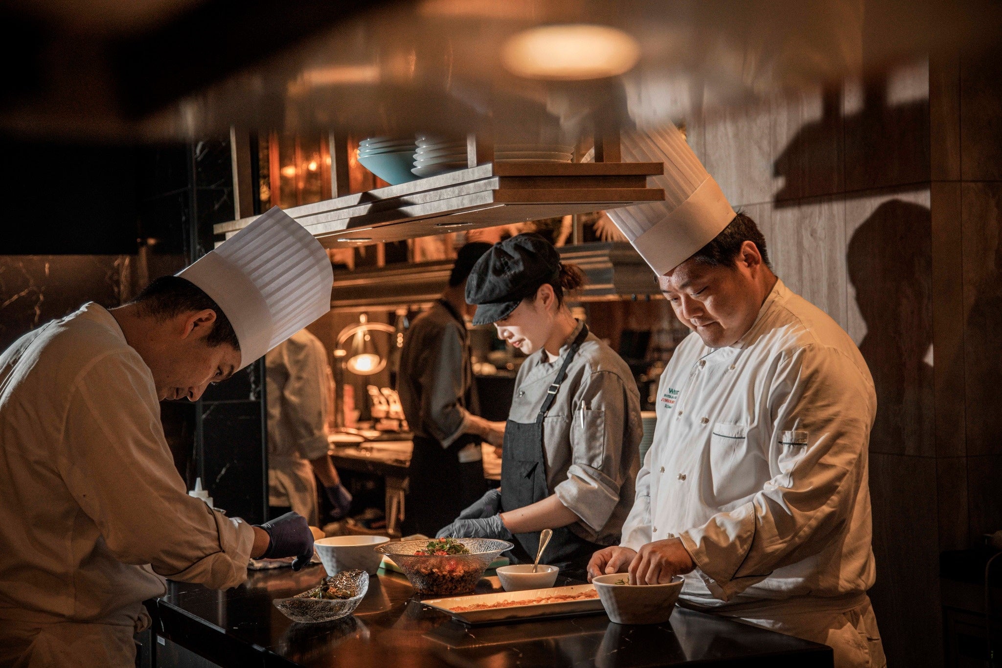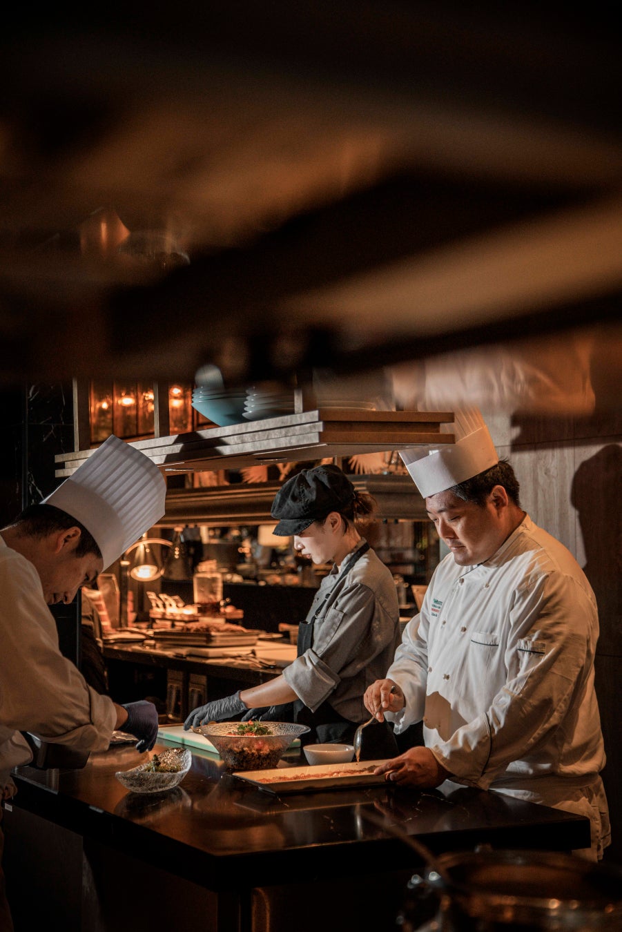 そのほか、和食の品々は、“だし”にこだわり、野菜や素材のうまさを最大限に引き出す調理をしてご提供。職人による握りたてをご体験いただける寿司と天ぷらのライブステーションでは、素材本来のおいしさを楽しんでいただくために、米にこだわり、魚にこだわり、具にこだわることで、“伝統”と“革新”をお届けいたします。