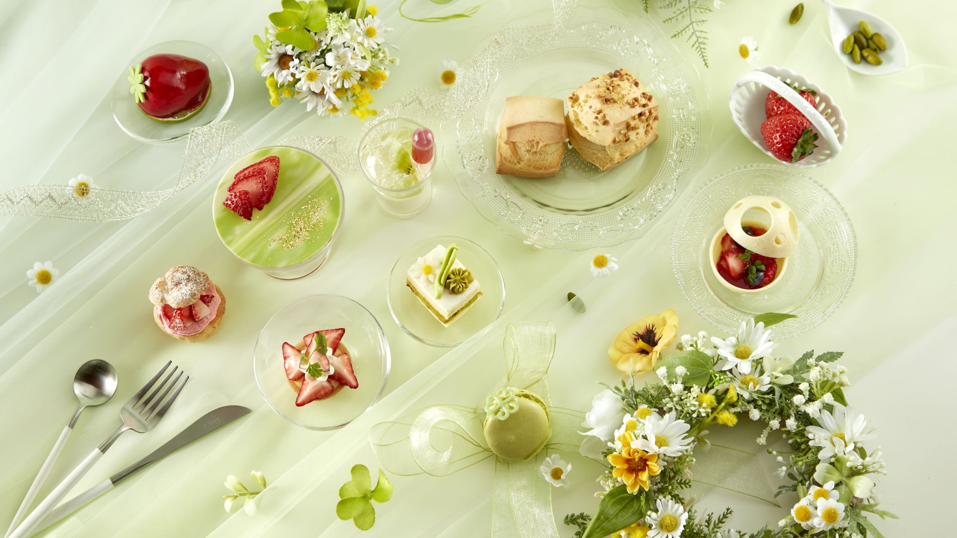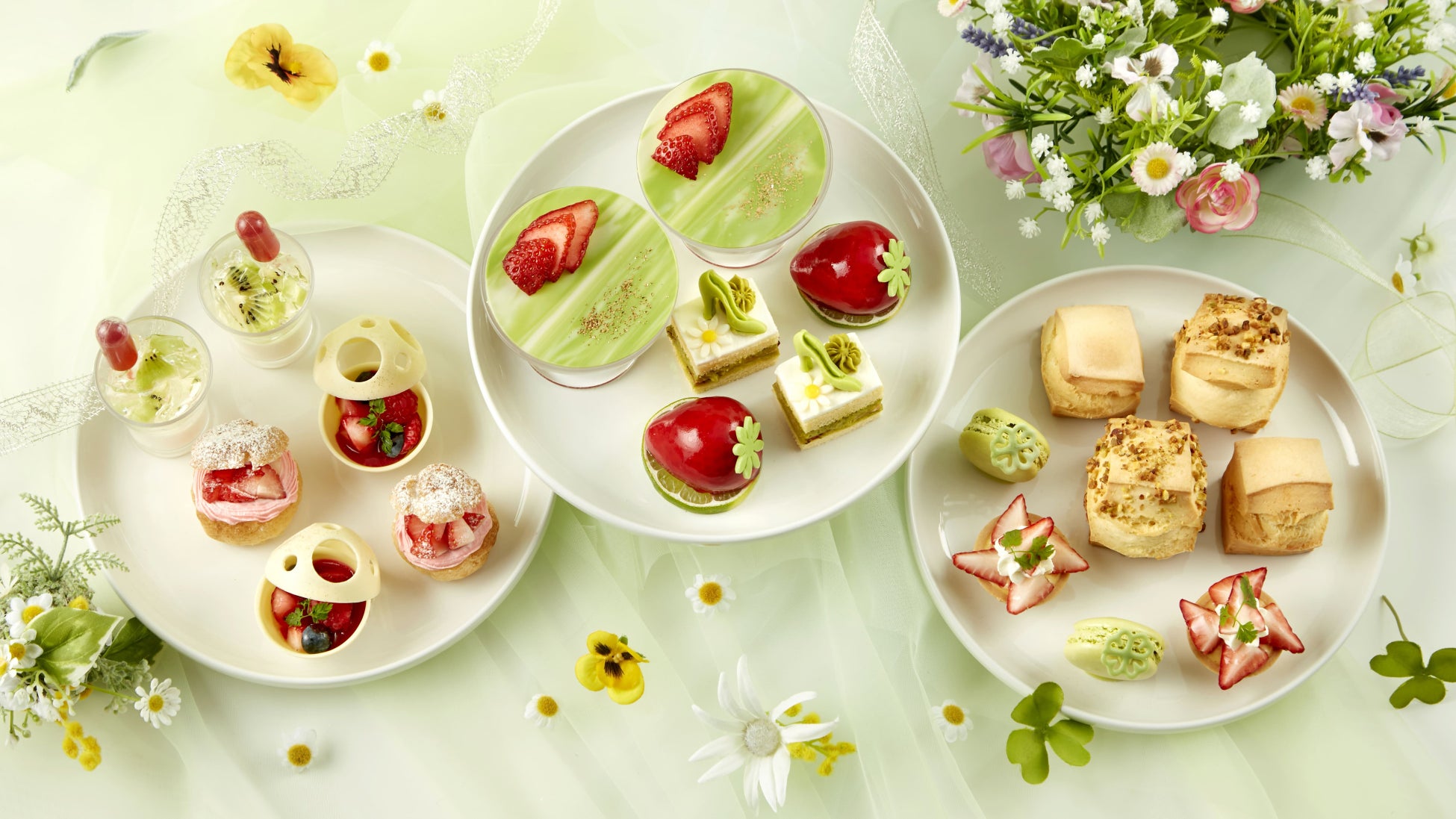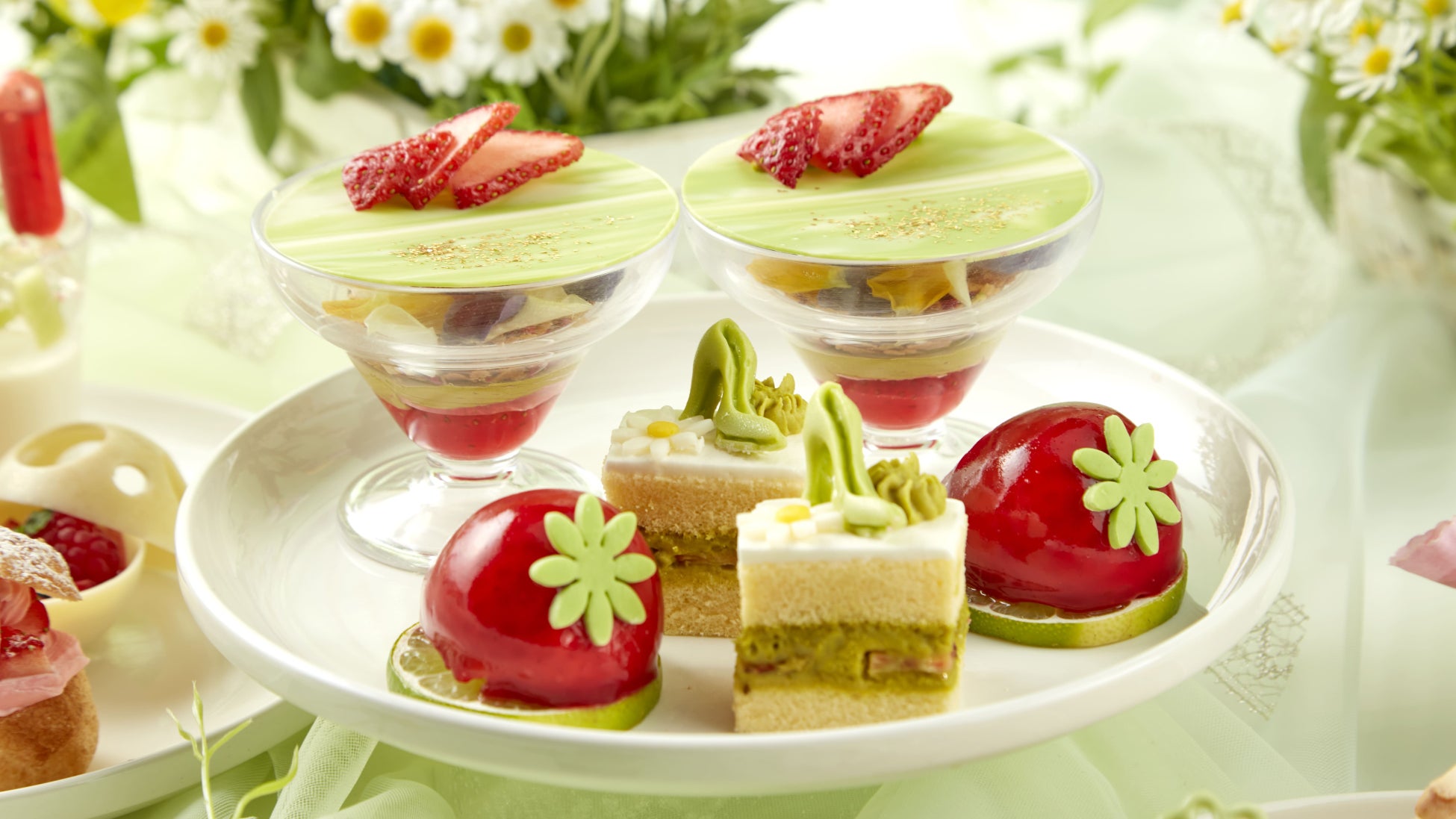 今回は、「スプリングガーデン」をテーマに、ライトグリーン・レッド・ホワイトのカラーで統一し、春に咲き誇る花や新芽をイメージしたアフタヌーンティーをご用意いたしました。