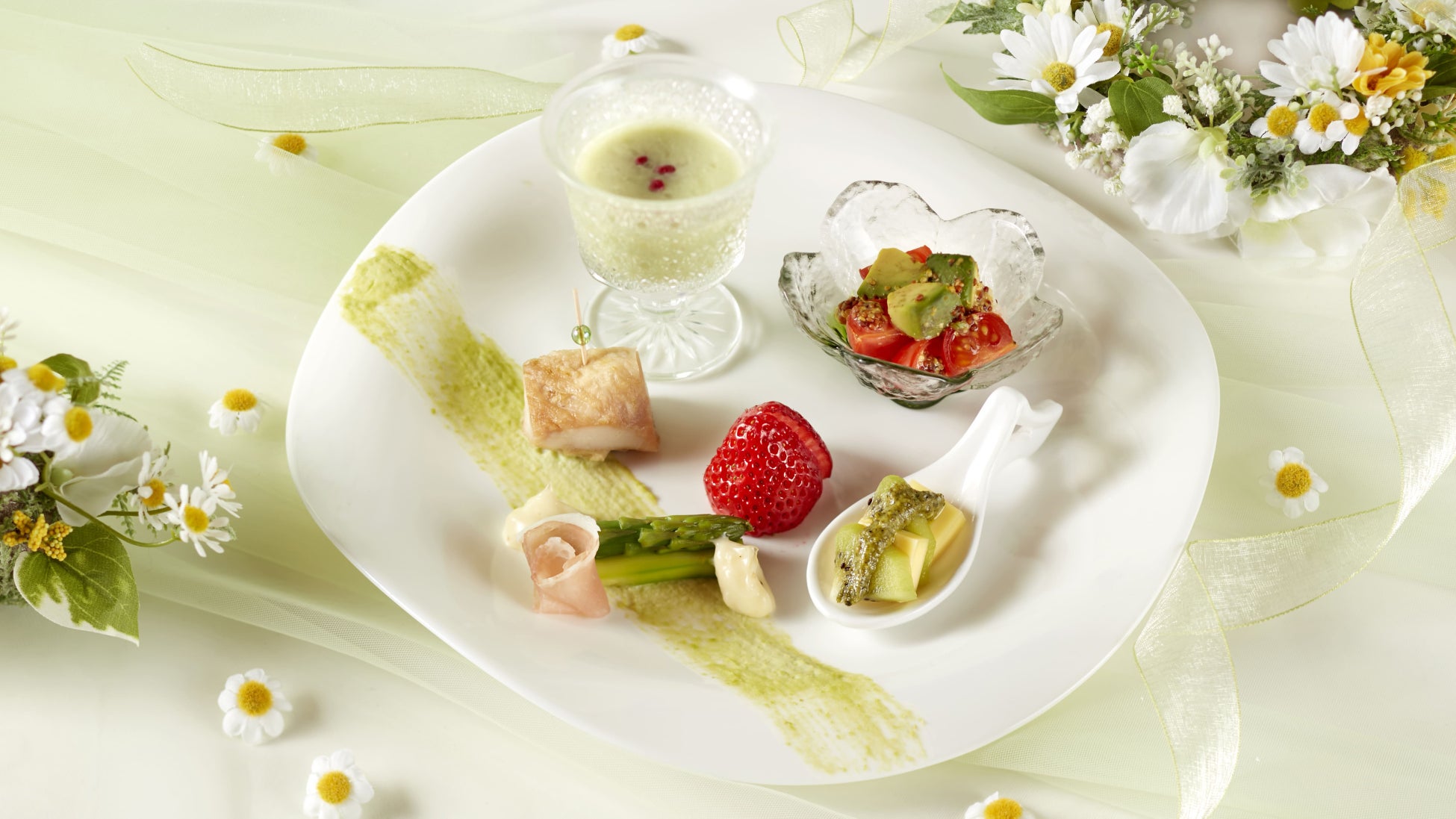 セイボリープレートでは、「アスパラガスと生ハムのオランデーズソース添え」や「グリーンピースのポタージュ」など、爽やかな新緑を表現いたしました。また、「ソイフードとキウイのカプレーゼ」は、チーズのような味わいが意外性のあるソイフードを使用。バジルソースとも相性が良くおすすめです。