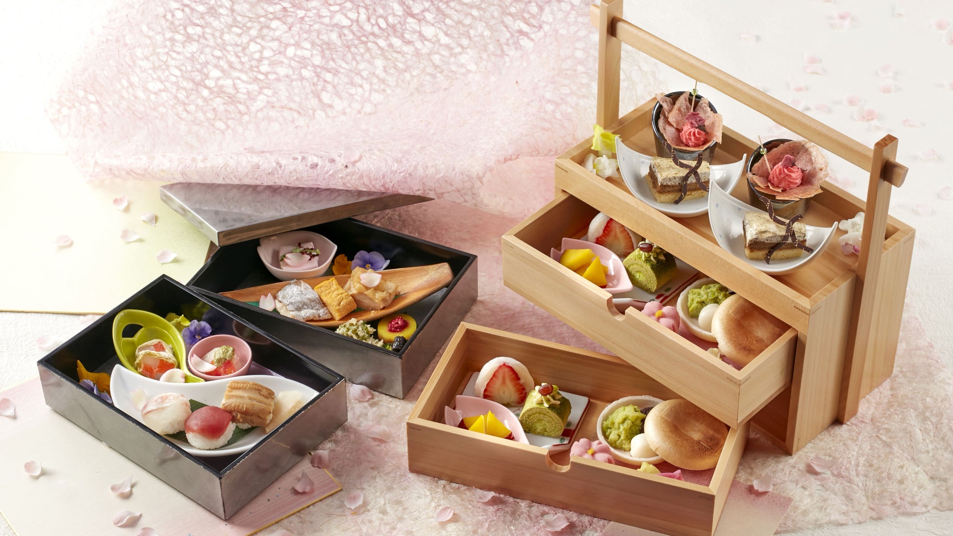 ランチタイム限定で、移り行く季節に合わせたお食事と甘味をお楽しみいただける和風アフタヌーンティーもご用意しております。期間中は春をテーマに華やかなメニューを取り揃えました。