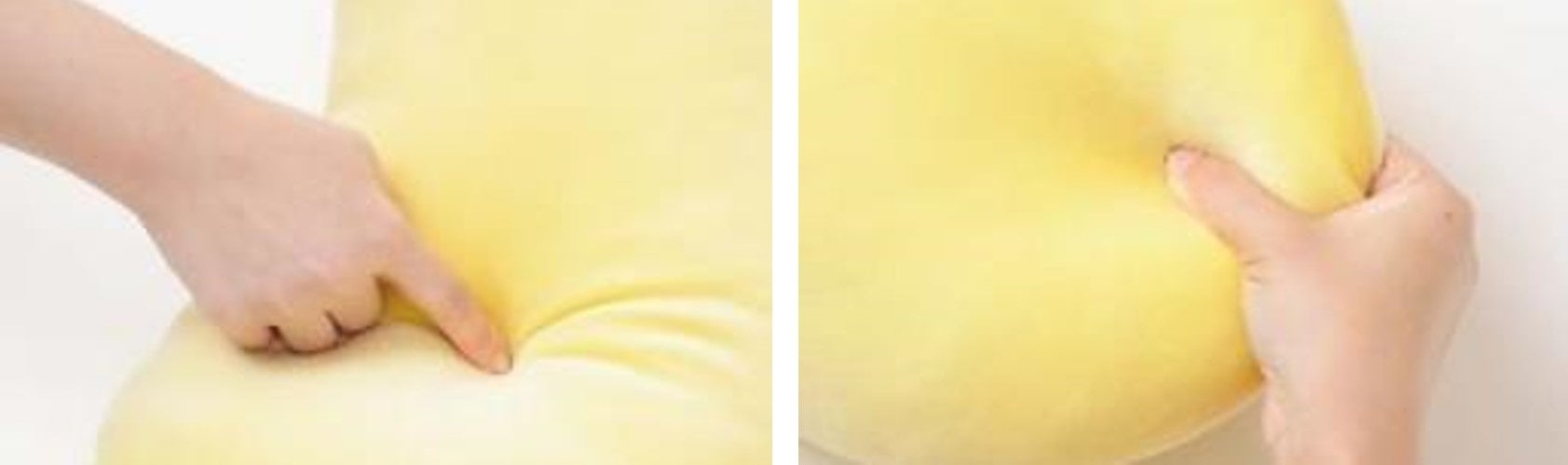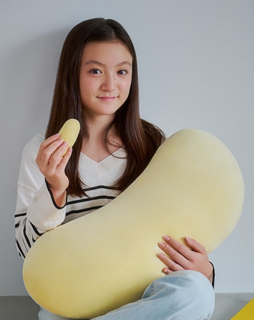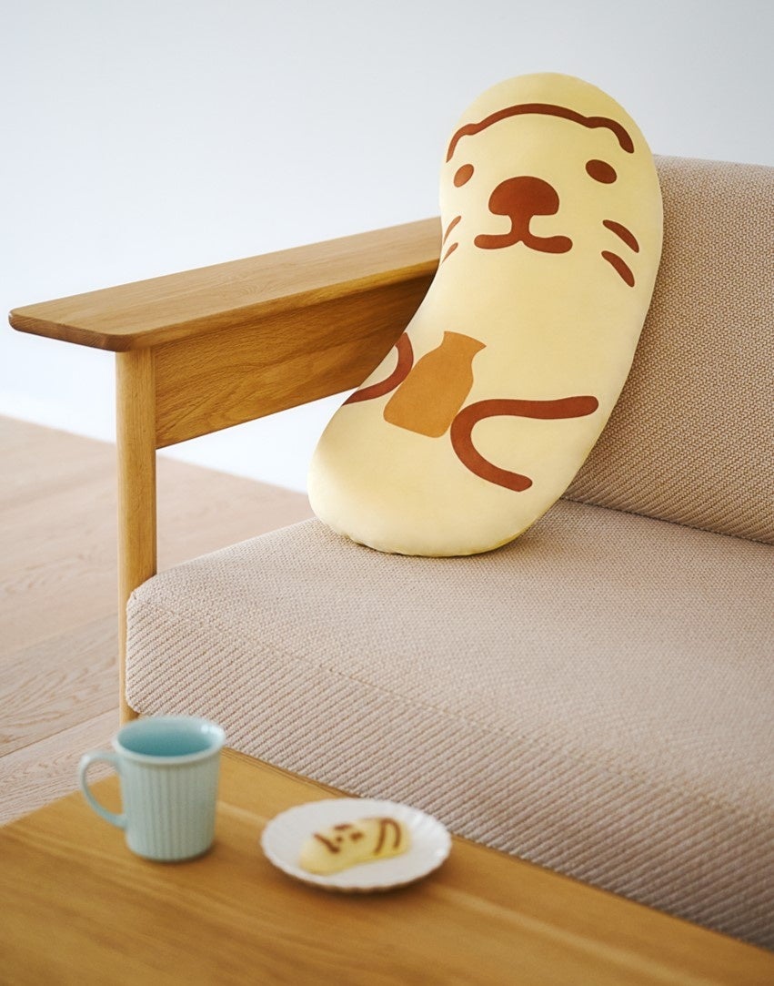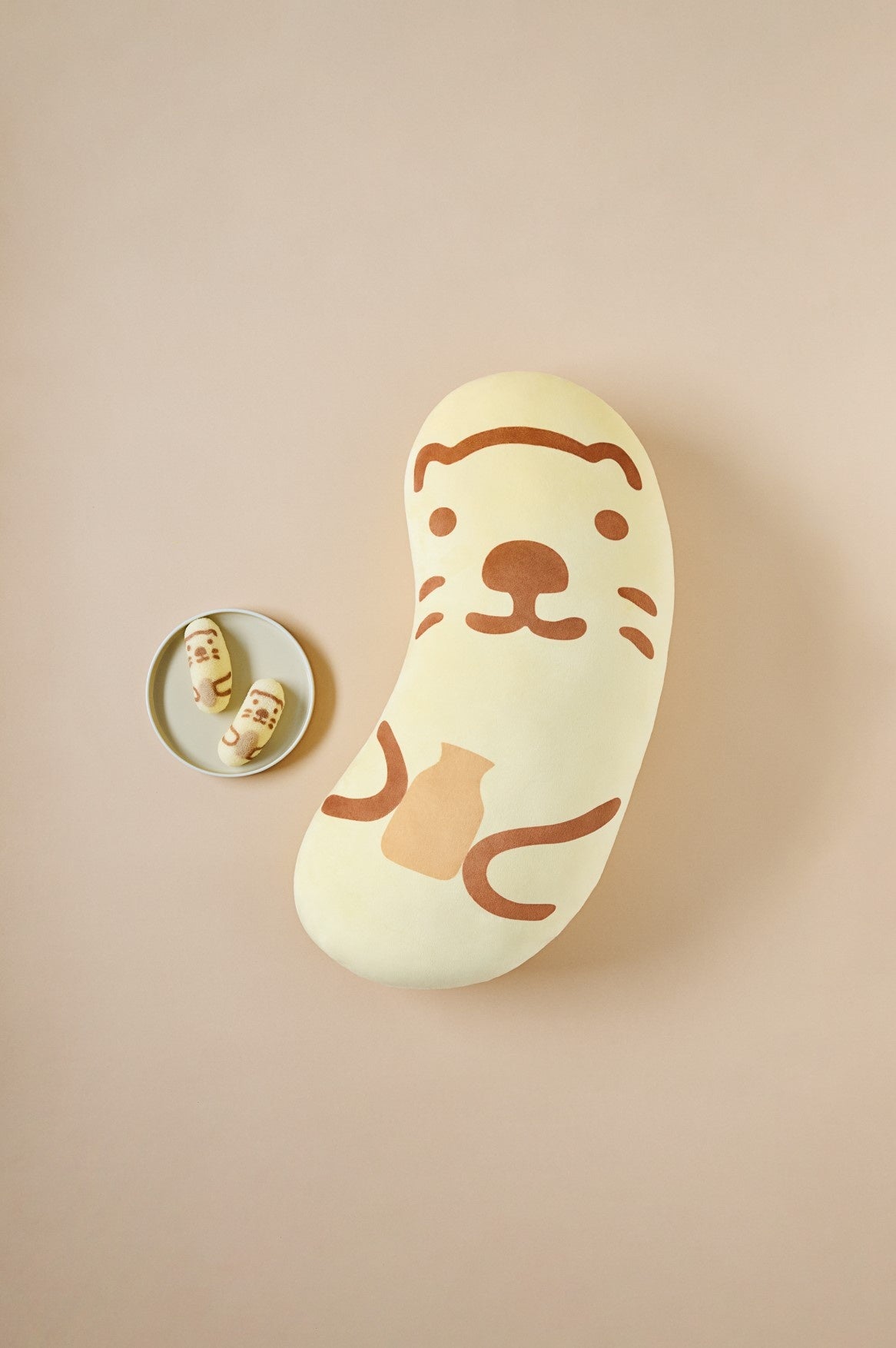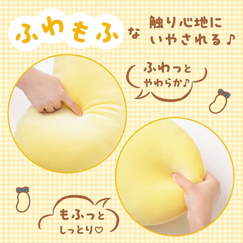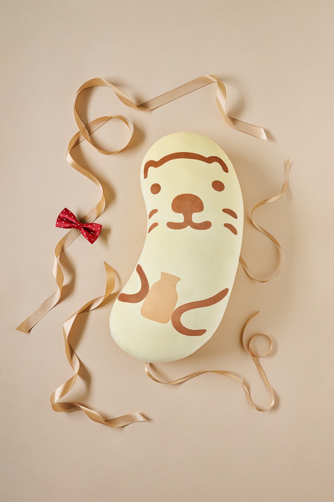 イエローの無地面と、コーヒー牛乳味の“東京ばな奈ラッコ”を再現した面のリバーシブル仕様になっています。ふんわり、しっとり、もちっとした触り心地は東京ばな奈そっくり。約60cmのビッグサイズで、ぬいぐるみとしてはもちろん、抱きまくらやクッションとしても使えます。