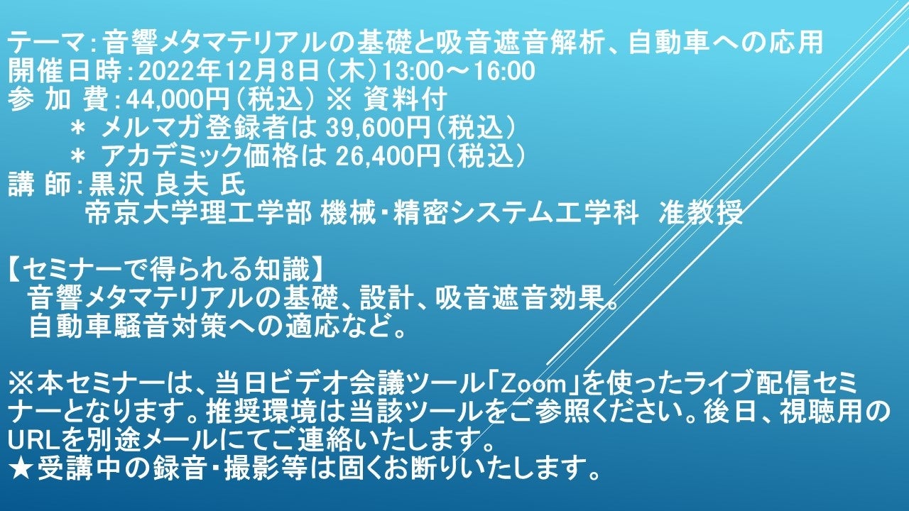 先端技術情報や市場情報を提供している(株)シーエムシー・リサーチ(千代田区神田錦町: https://cmcre.com/ )では、 各種材料・化学品などの市場動向・技術動向のセミナーや書籍発行を行っておりますが、 このたび「音響メタマテリアルの基礎と吸音遮音解析、自動車への応用」と題するセミナーを、 講師に黒沢 良夫 氏 帝京大学理工学部 機械・精密システム工学科 准教授)をお迎えし、2022年12月8日(木)13:00より、 ZOOMを利用したライブ配信で開催いたします。 受講料は、 一般:44,000円(税込)、 弊社メルマガ会員:39,600円(税込)、 アカデミック価格は26,400円(税込)となっております(資料付)。