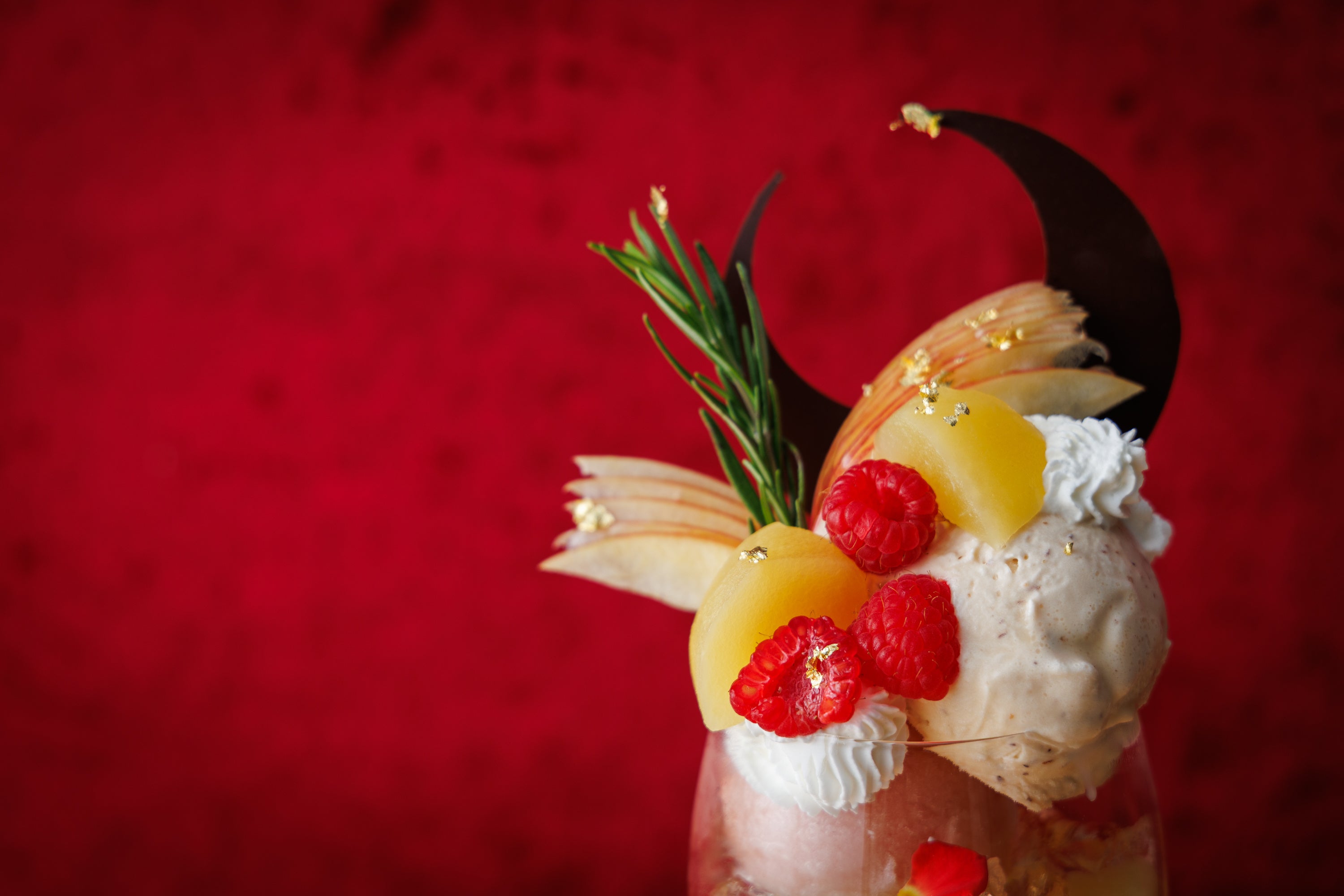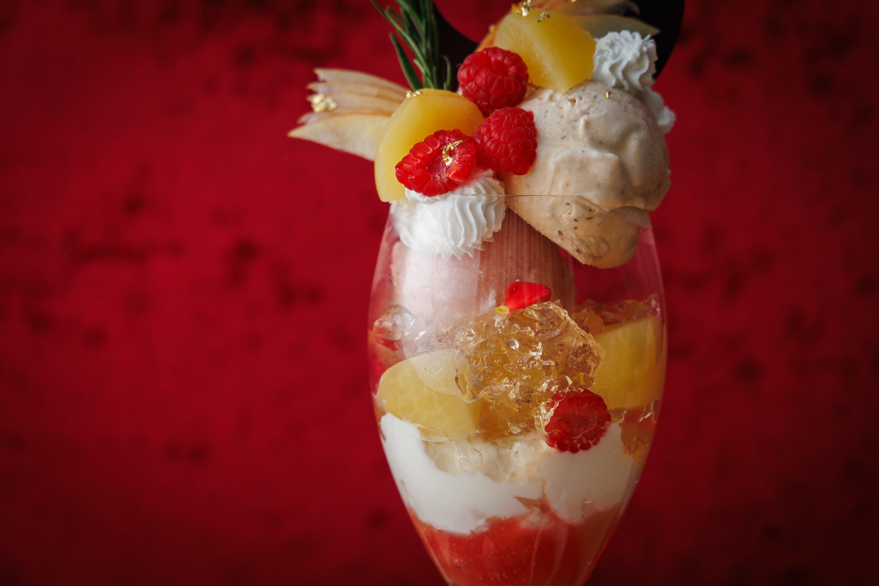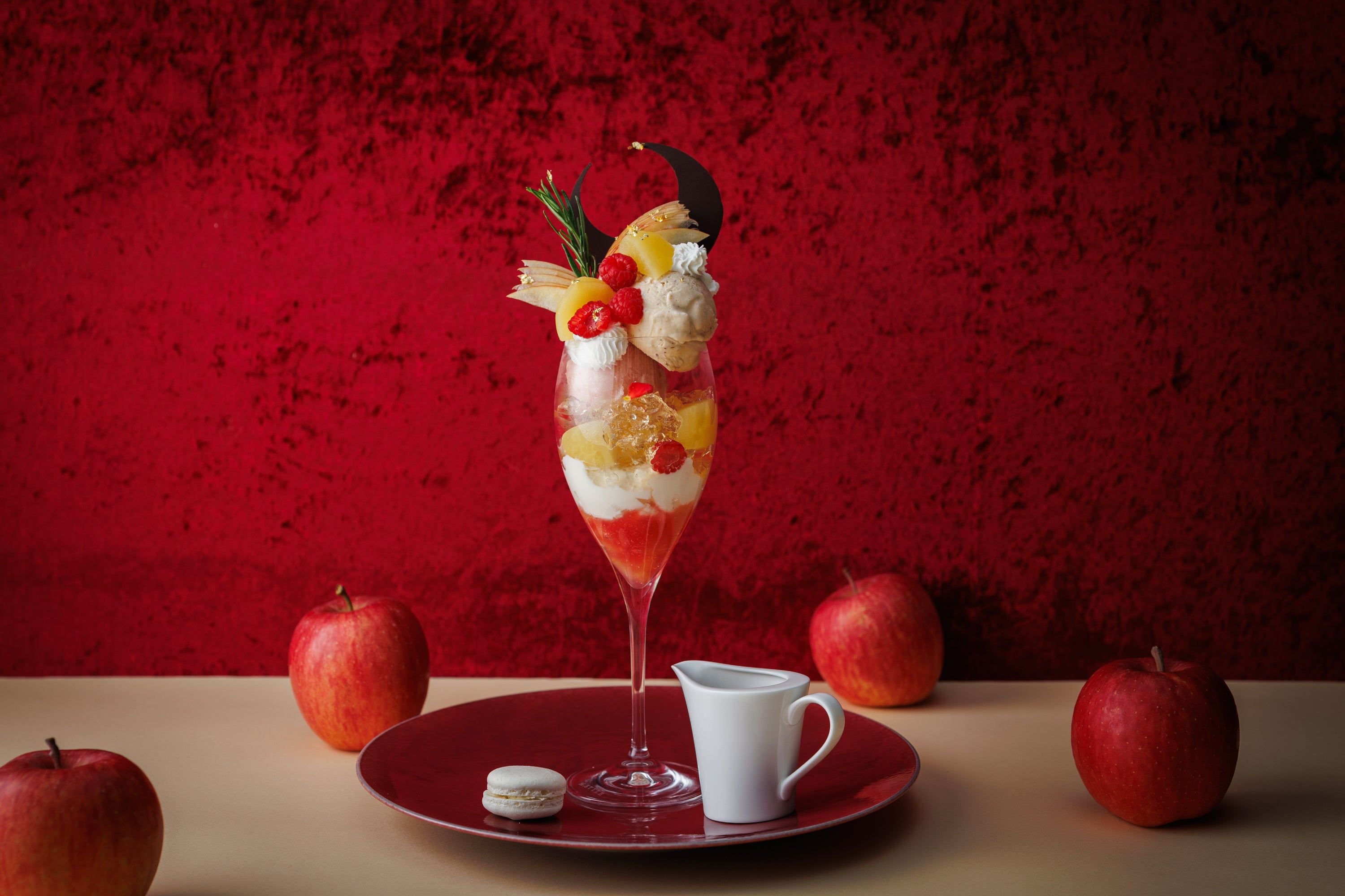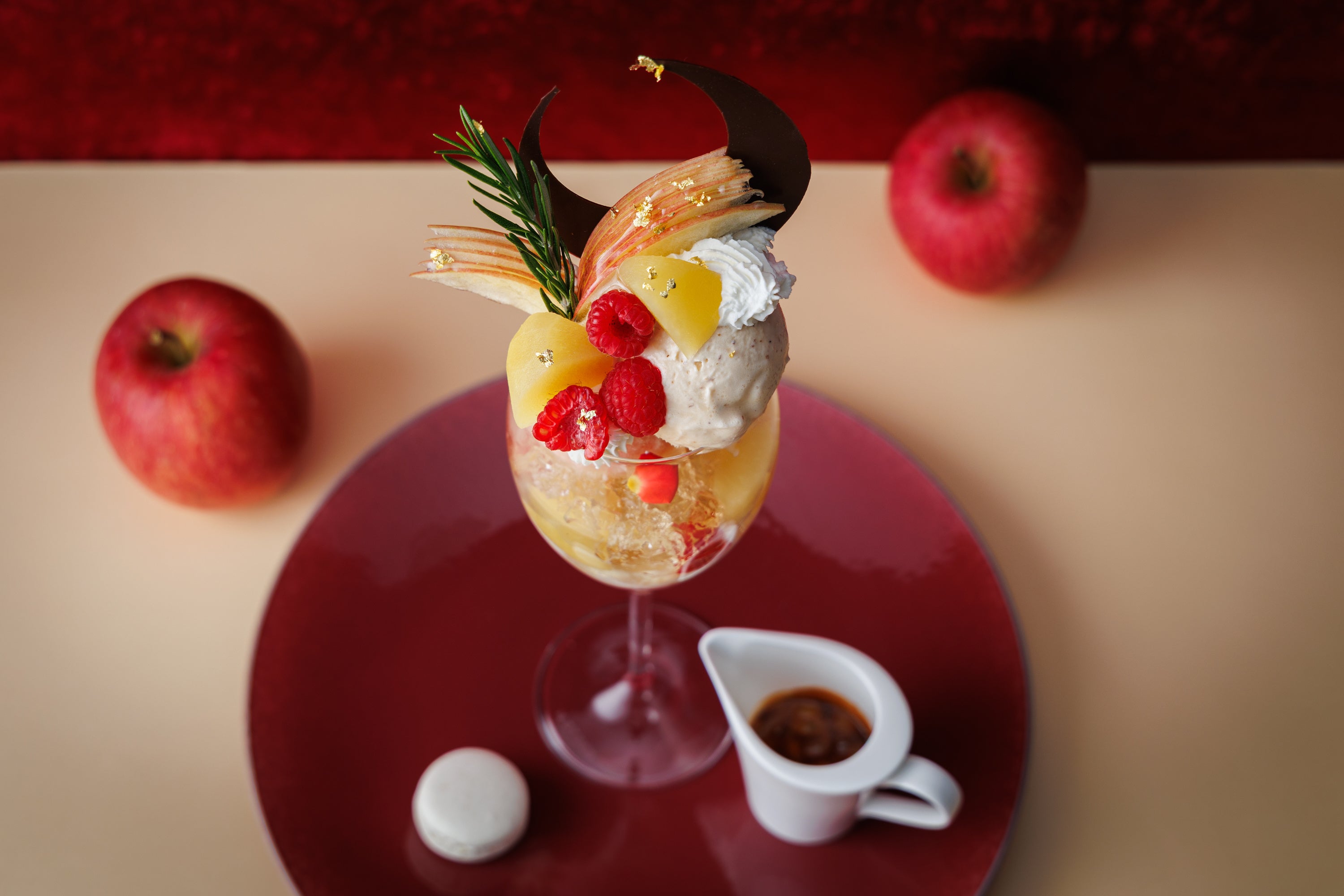 クリスマス・お正月・バレンタインにぴったりの色合いで、りんごの魅力を存分に。“りんごの王道”とも称される紅玉や旬のりんごを贅沢に使用。上品な甘さと酸味が特徴のりんごのコンポートやソルベは、口に含むと芳醇な香りが鼻を突き抜けます。ルイボスティーとはちみつのアイスはパティシエの自信作。また白ワインとローズマリーのジュレ、マスカルポーネのパンナコッタなどが主役であるりんごを引き立たせます。別添えのりんごとキャラメルの温かいソースをかけることで、まったく異なる味わいに変化。りんごの爽やかさとキャラメルのビターな味わいが、パフェに深みを生み出します。甘味・酸味・苦味・香り・温かさの層が折り重なり、最後のひと口まで飽きることなく楽しめる、冬ならではの贅沢な一品です。