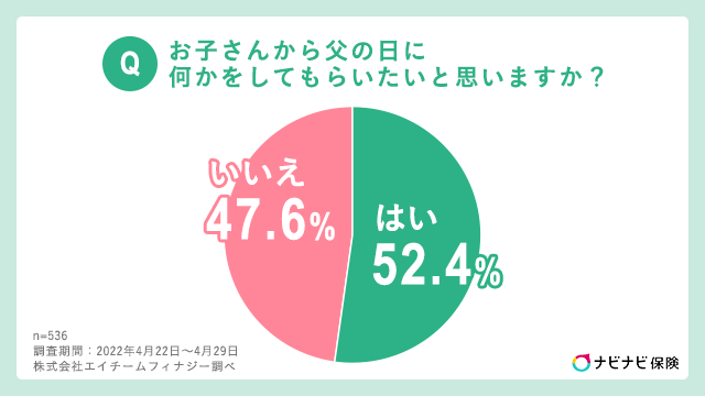 小学生から大学生のお子さんをお持ちのお父さんに、「父の日に何かしてもらいたいと思いますか?」と質問したところ、「はい」と回答した人は約半数の52.4%でした。