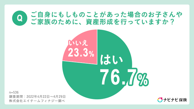そこで、「ご自身の身にもしものことがあった場合に、お子さんやご家族のために資産形成を行っていますか?」という質問をしてみたところ、なんと76.7%もの方が「はい」と回答。