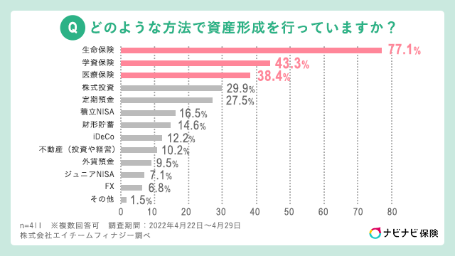 もしものときに備えて行っている資産形成の方法としては、「生命保険」が77.1%、「学資保険」が43.3%、「医療保険」が38.4%と、上位3つを全て保険が占めるという結果に。