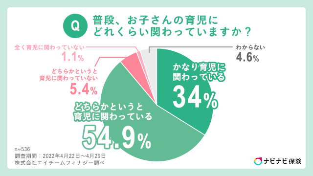 「普段、お子さんの育児にどれくらい関わっていますか?」と尋ねたところ、34%が「かなり関わっている」、54.9%が「どちらかというと関わっている」と回答。