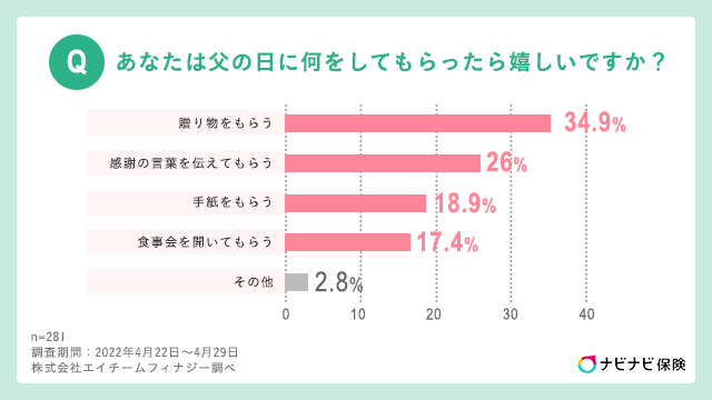 続いて、先程の質問で「父の日に何かをしてもらいたい」と回答した方に向けて、「何をしてもらったら嬉しいですか?」と尋ねたところ、最も多かったのが「贈り物をもらう」の34.9%、次いで「感謝の言葉を伝えてもらう」が26%という結果となりました。