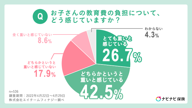 さらに、「お子さんの教育費の負担について、どう感じていますか?」と質問してみたところ、26.7%が「とても重いと感じている」、42.5%が「どちらかというと重いと感じている」と、約7割のお父さんが、お子さんの教育費を負担に感じていることが分かりました。