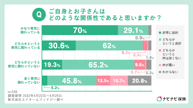 さらに、お子さんとの関係性について質問したところ、先程「かなり育児に関わっている」と回答した方の99%以上が「お子さんとの関係性は良好」という結果に。