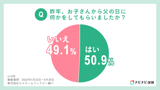 一方で、「昨年、お子さんから父の日に何かしてもらいましたか?」という質問に対しても、50.9%の方が「はい」と回答しました。
