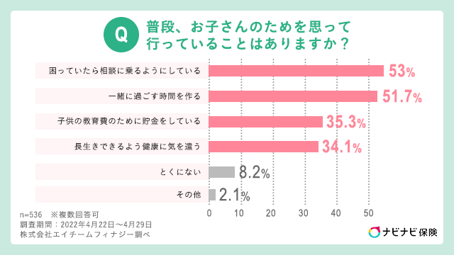 「普段、お子さんのためを思って行っていることはありますか?」という質問に対しては、53%の方が「困っていたら相談に乗るようにしている」、次いで51.7%の方が、「一緒に過ごす時間を作る」と回答するなど、半数以上のお父さんが、お子さんとの過ごし方について意識しているようです。