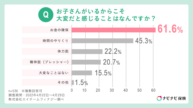 ここまで、お子さんとの嬉しかった思い出や、関係性についての質問を行いましたが、一方で「お子さんがいるからこそ大変だと感じることはなんですか?」という質問をした結果、61.6%が「お金の確保」と回答しました。