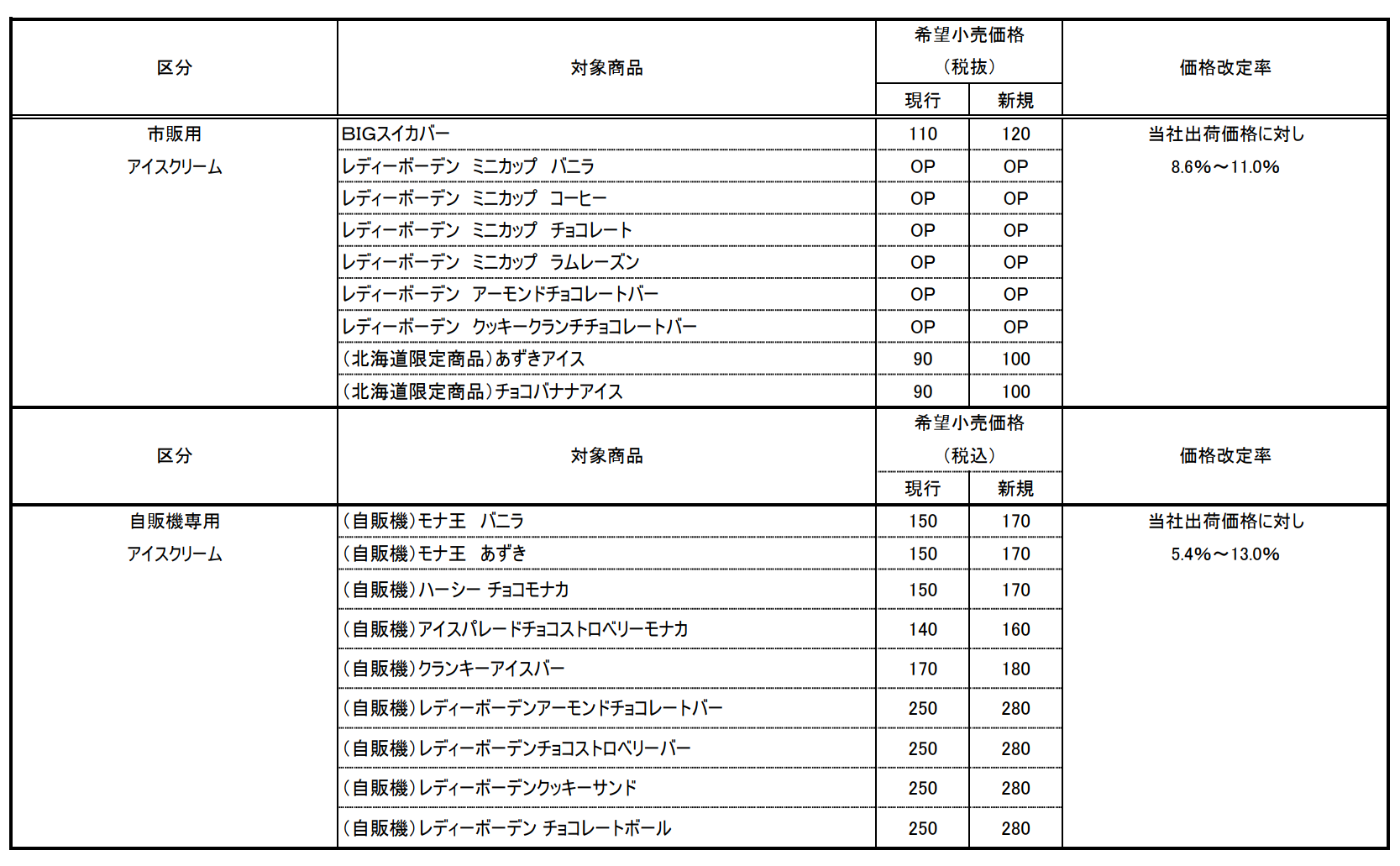 アイスクリーム価格改定一覧表