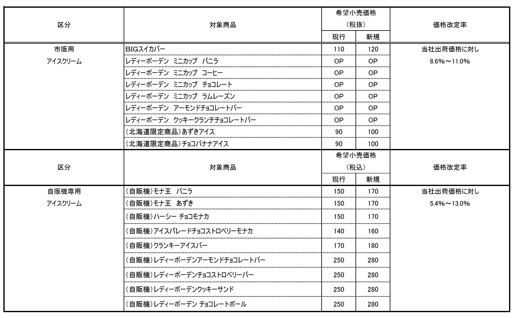 アイスクリーム価格改定商品