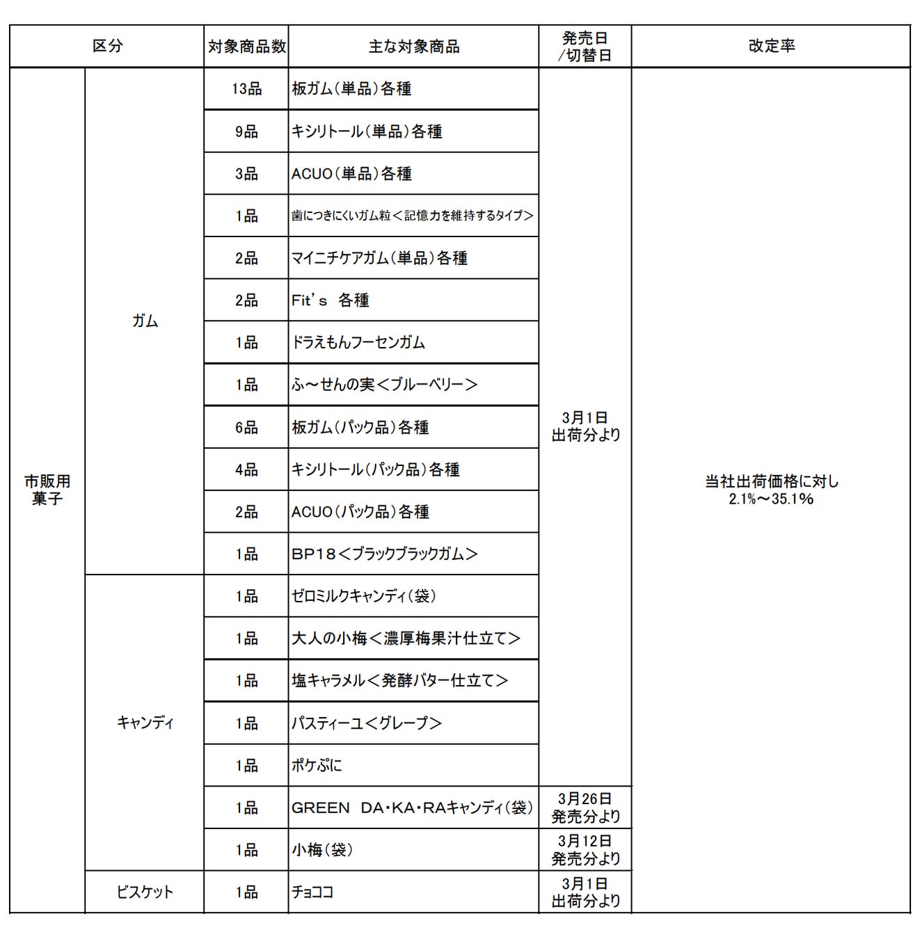 菓子価格改定及び内容量変更一覧表