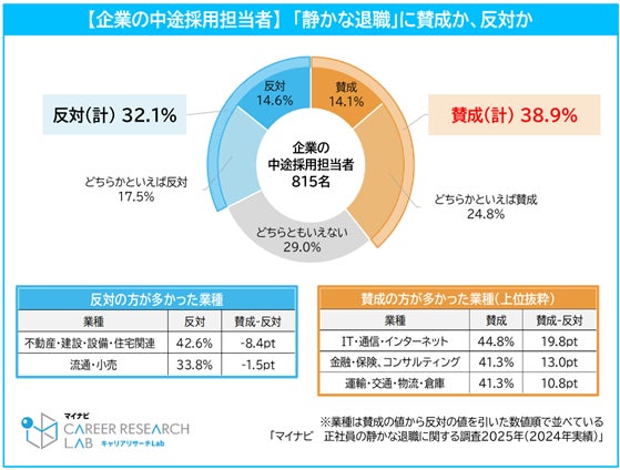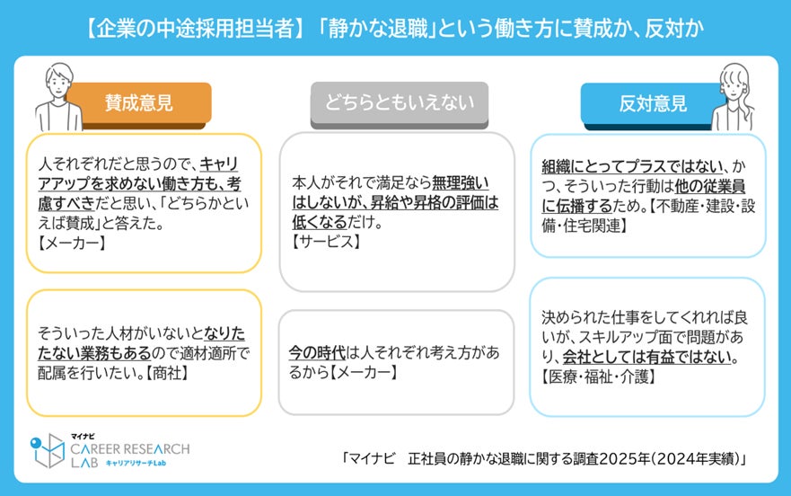 ◆企業の中途採用担当者の約4割は「静かな退職」に賛成、「人それぞれ」「キャリアアップを求めない働き方も考慮すべき」。反対派は周囲への影響や会社への有益性を懸念
