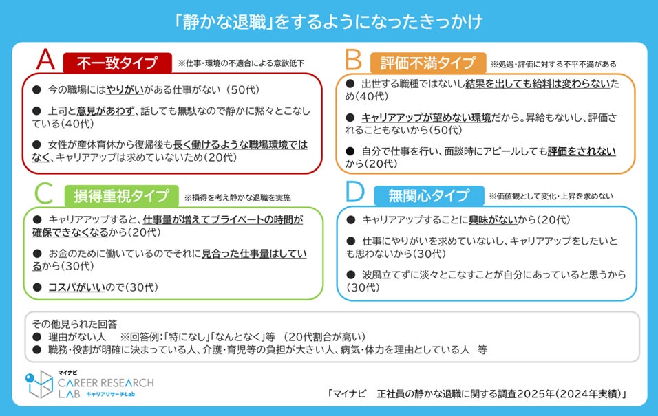 「静かな退職」をするようになったきっかけを自由回答で聞き、回答をA~Dタイプの4つに分類した。
